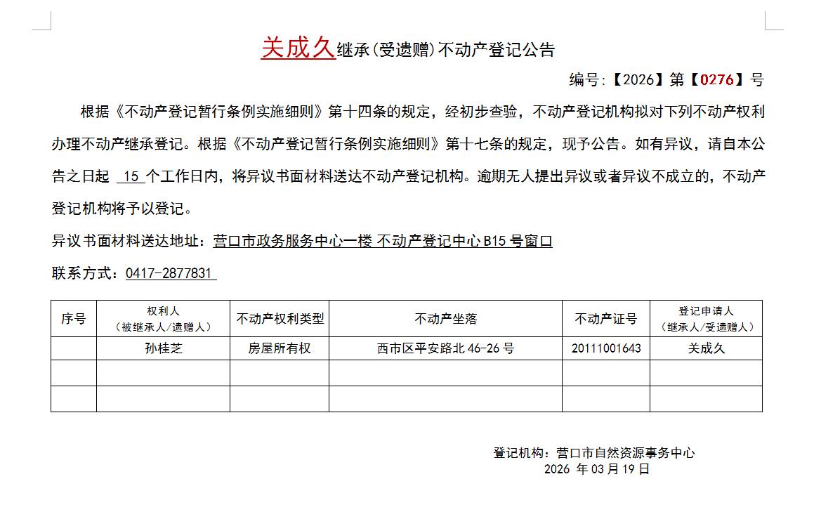 关成久继承(受遗赠)不动产登记公告-公示公告-营口市不动产登记中心