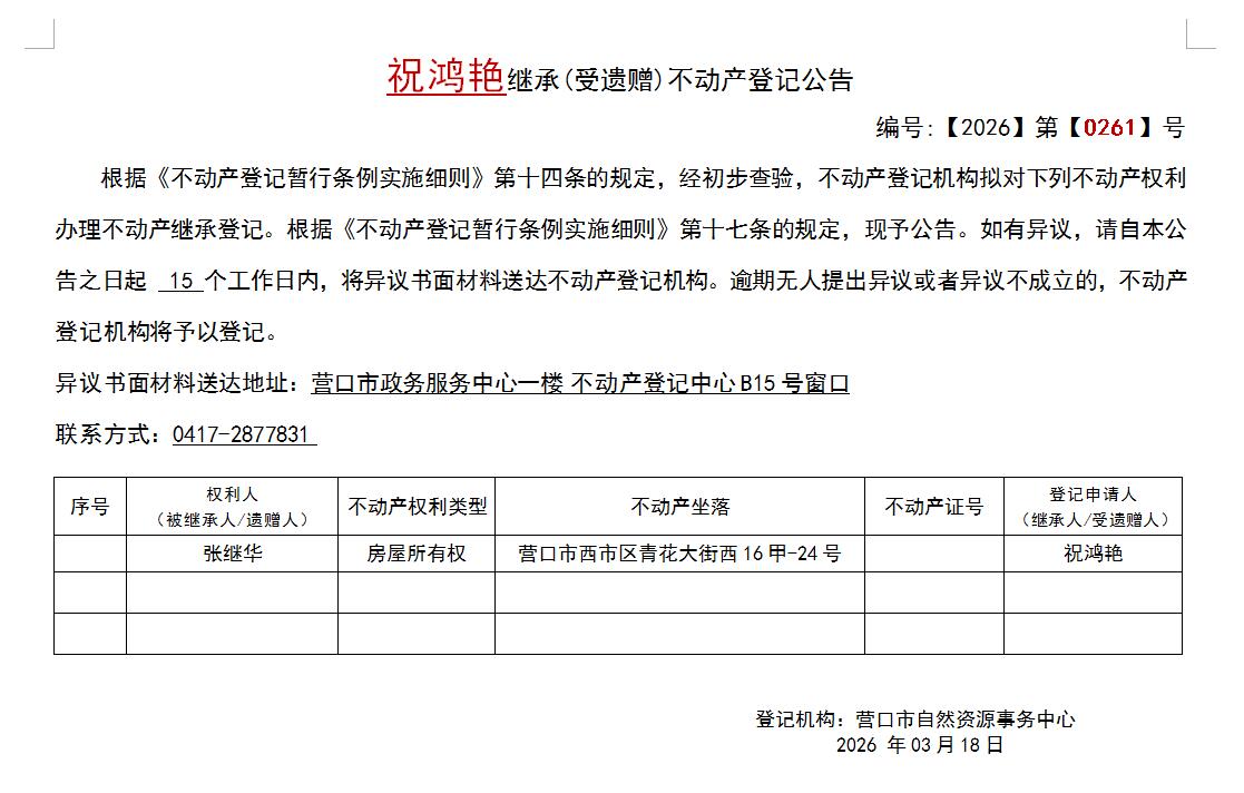 祝鸿艳继承(受遗赠)不动产登记公告-公示公告-营口市不动产登记中心