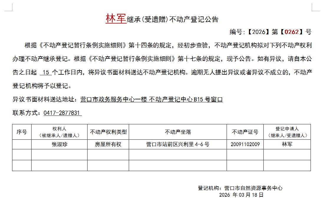 林军继承(受遗赠)不动产登记公告-公示公告-营口市不动产登记中心