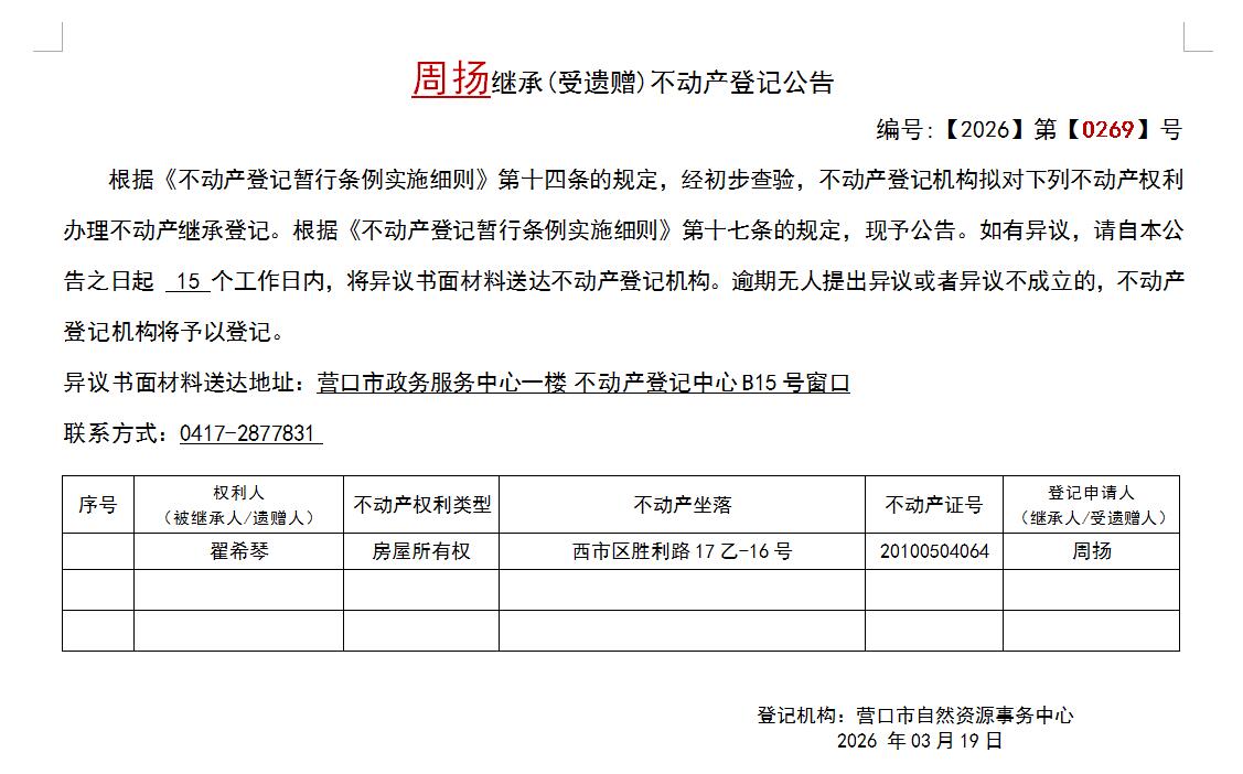 周扬继承(受遗赠)不动产登记公告-公示公告-营口市不动产登记中心