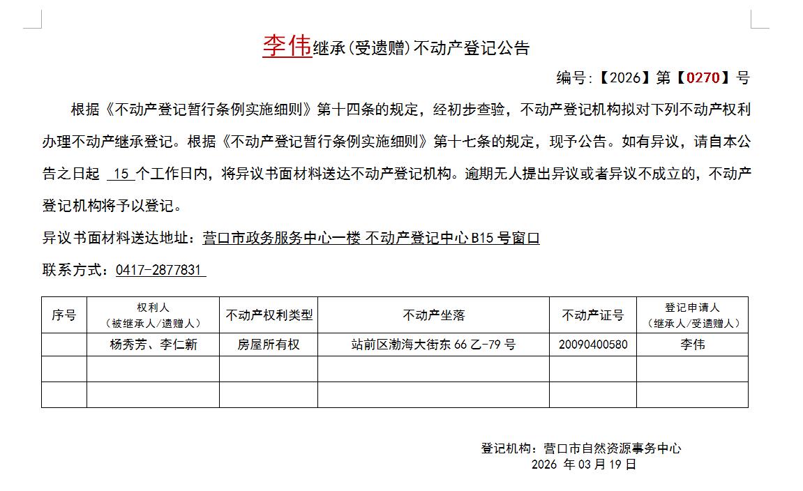 李伟继承(受遗赠)不动产登记公告-公示公告-营口市不动产登记中心