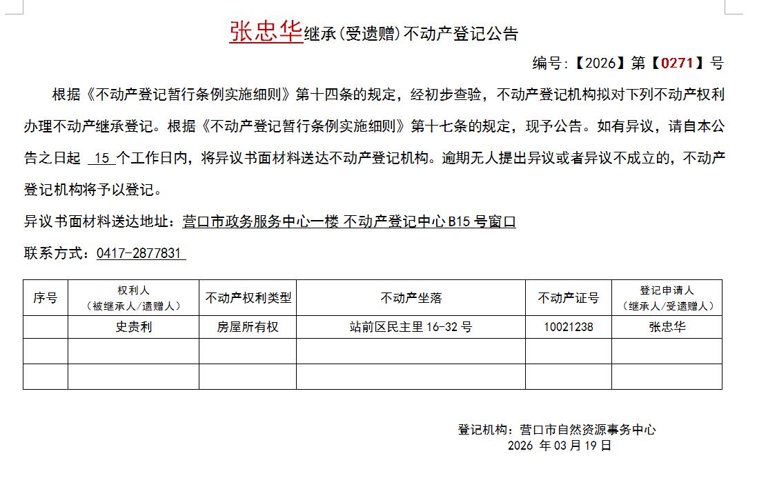 张忠华继承(受遗赠)不动产登记公告-公示公告-营口市不动产登记中心