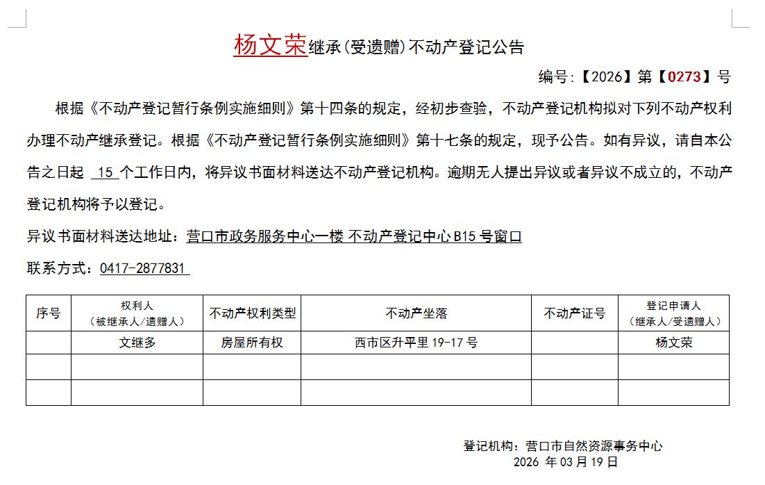 杨文荣继承(受遗赠)不动产登记公告-公示公告-营口市不动产登记中心