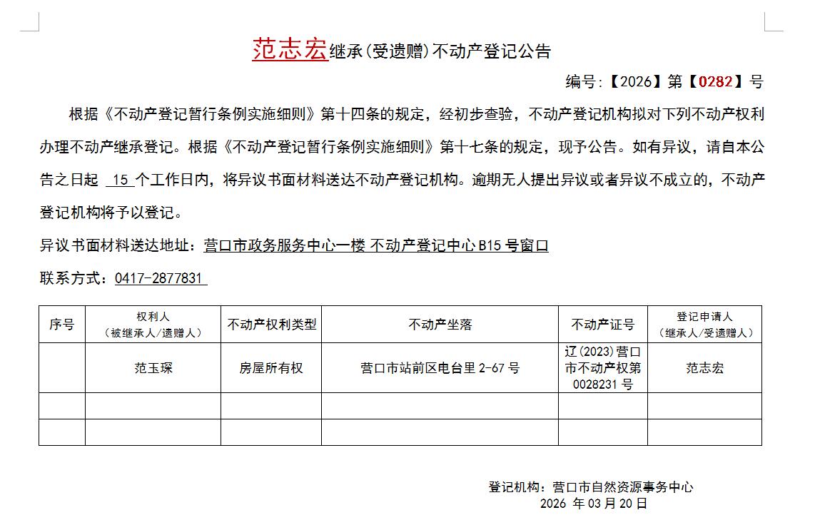 范志宏继承(受遗赠)不动产登记公告-公示公告-营口市不动产登记中心