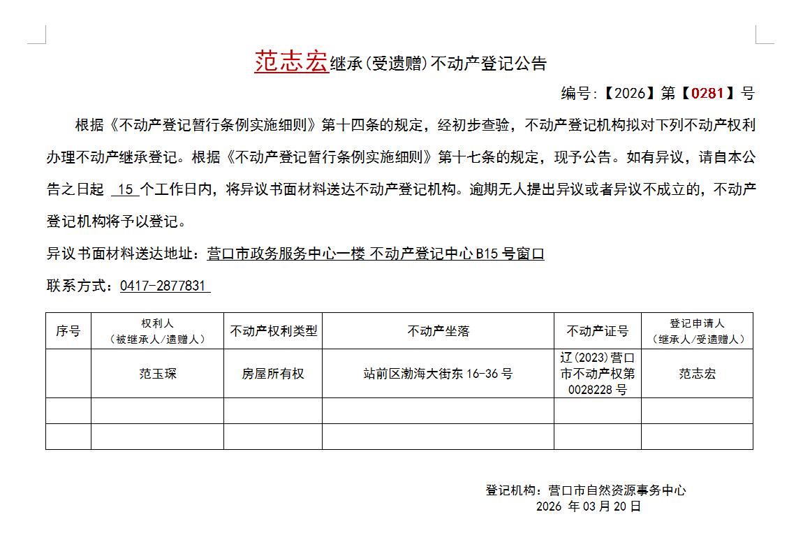 范志宏继承(受遗赠)不动产登记公告-公示公告-营口市不动产登记中心
