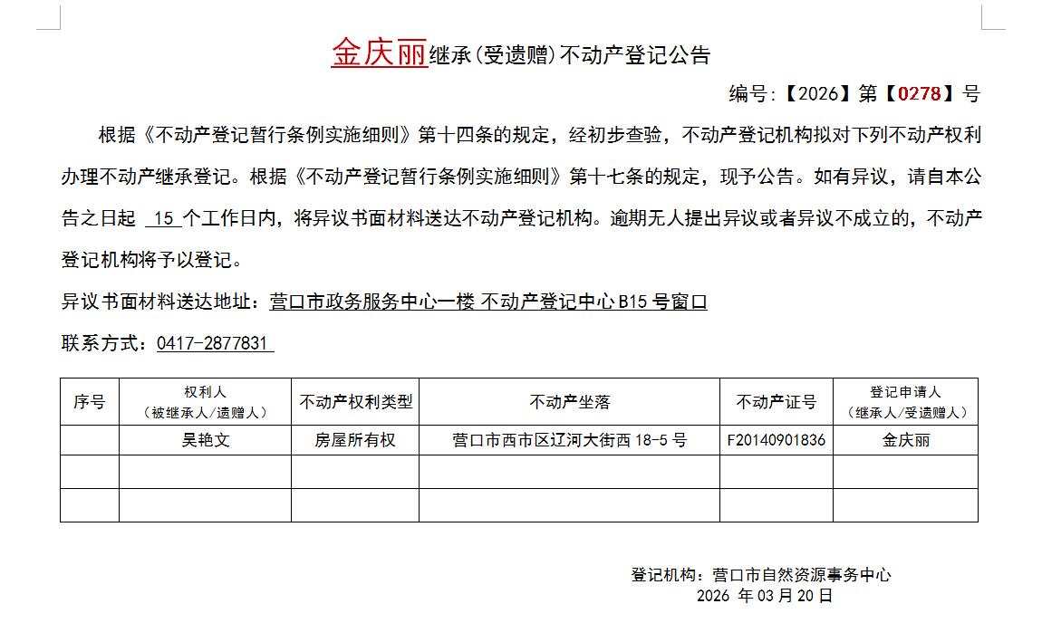 金庆丽继承(受遗赠)不动产登记公告-公示公告-营口市不动产登记中心