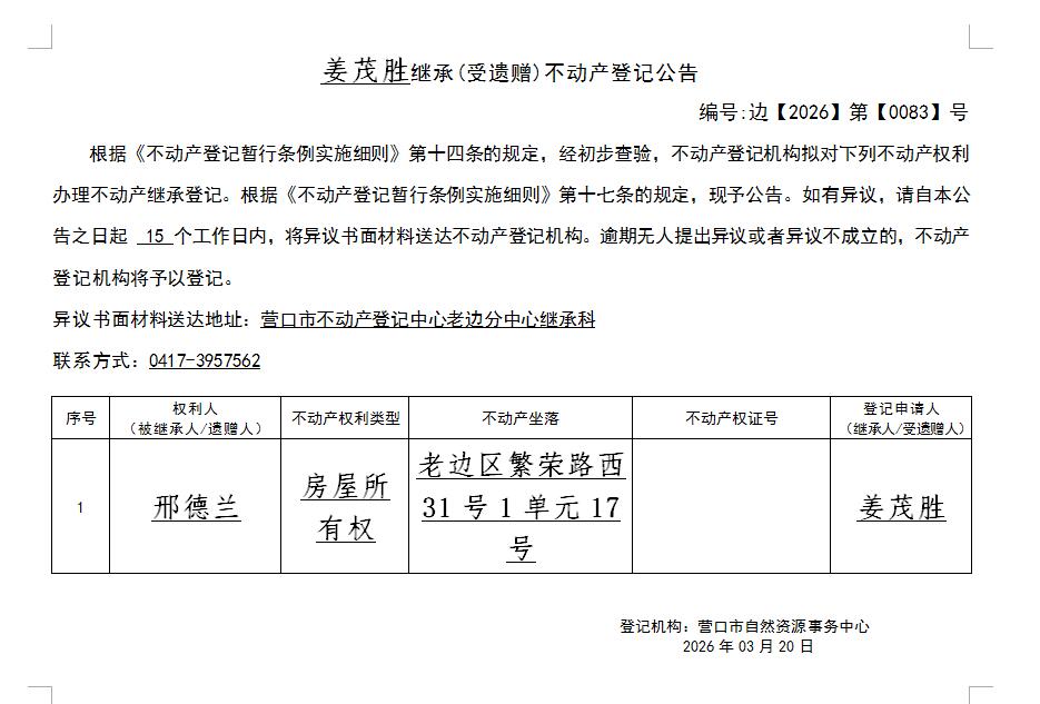 姜茂胜继承(受遗赠)不动产登记公告-公示公告-营口市不动产登记中心