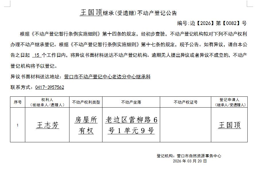王国顶继承(受遗赠)不动产登记公告-公示公告-营口市不动产登记中心