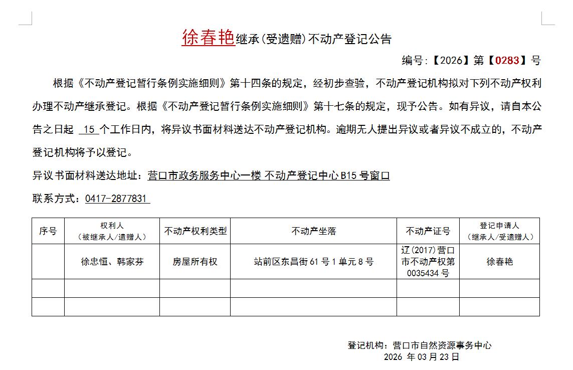 徐春艳继承(受遗赠)不动产登记公告-公示公告-营口市不动产登记中心