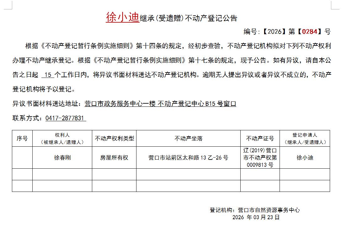 徐小迪继承(受遗赠)不动产登记公告-公示公告-营口市不动产登记中心