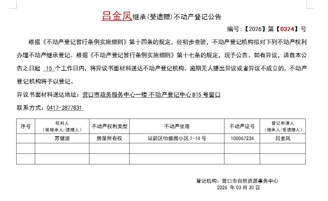 吕金凤继承(受遗赠)不动产登记公告-公示公告-营口市不动产登记中心