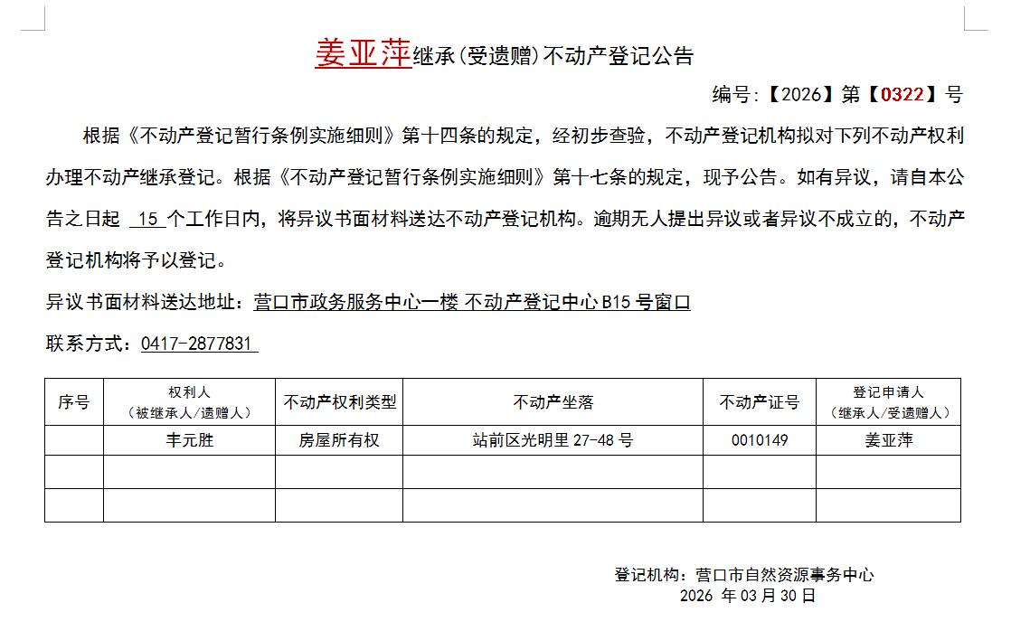 姜亚萍继承(受遗赠)不动产登记公告-公示公告-营口市不动产登记中心