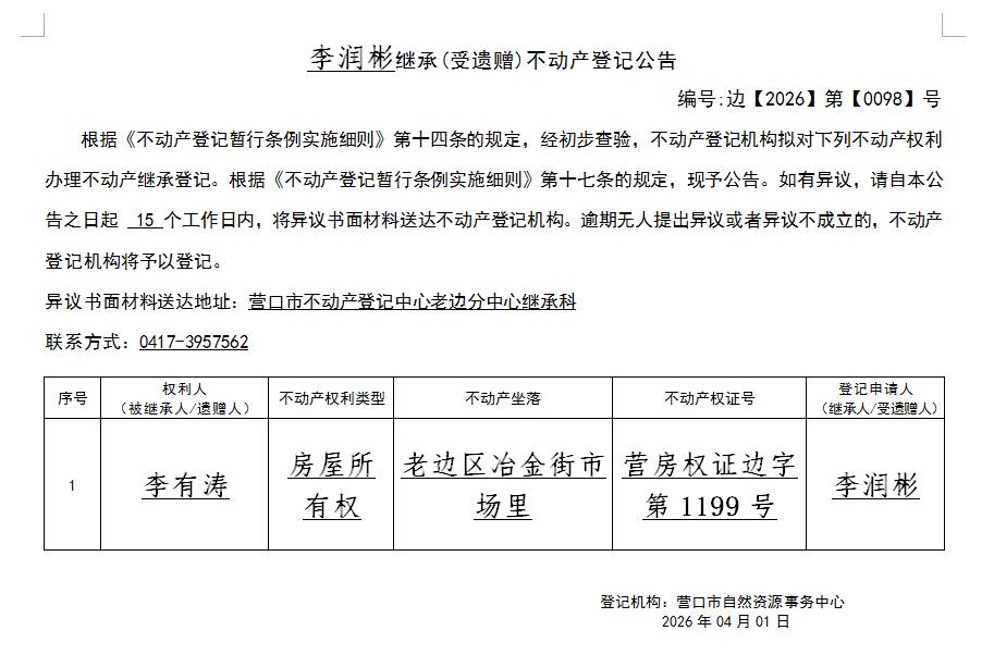 李润彬继承(受遗赠)不动产登记公告-公示公告-营口市不动产登记中心