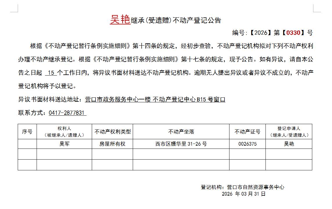 吴艳继承(受遗赠)不动产登记公告-公示公告-营口市不动产登记中心