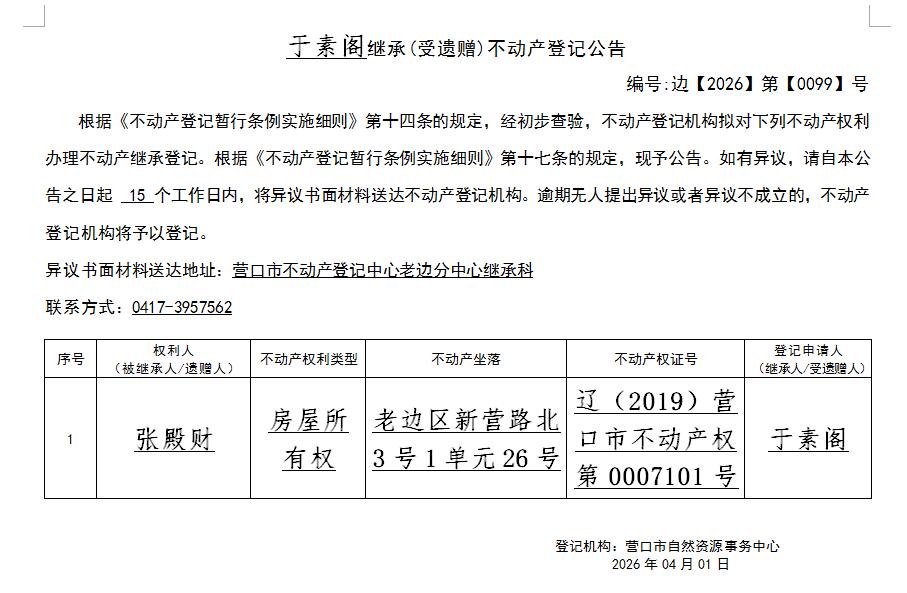 于素阁继承(受遗赠)不动产登记公告-公示公告-营口市不动产登记中心