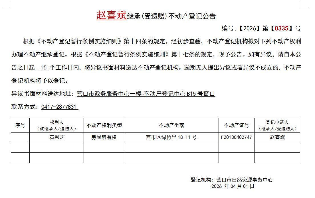 赵喜斌继承(受遗赠)不动产登记公告-公示公告-营口市不动产登记中心