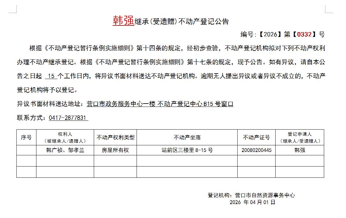 韩强继承(受遗赠)不动产登记公告-公示公告-营口市不动产登记中心