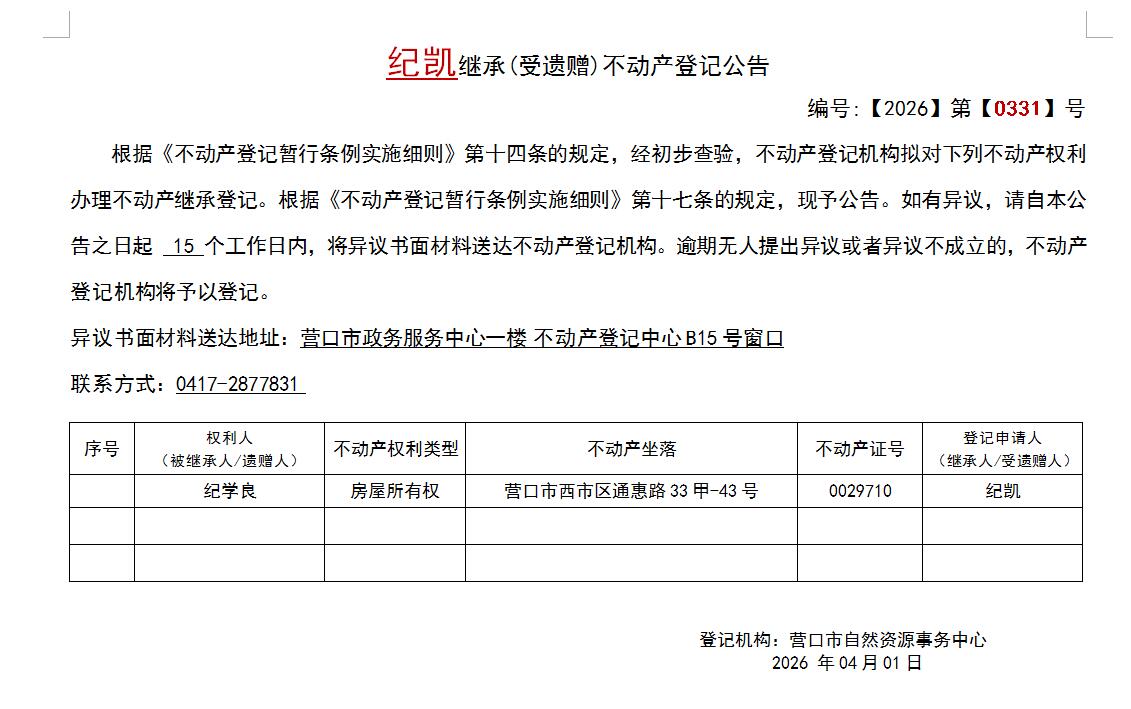 纪凯继承(受遗赠)不动产登记公告-公示公告-营口市不动产登记中心