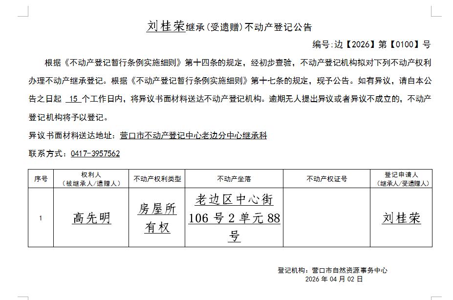 刘桂荣继承(受遗赠)不动产登记公告-公示公告-营口市不动产登记中心