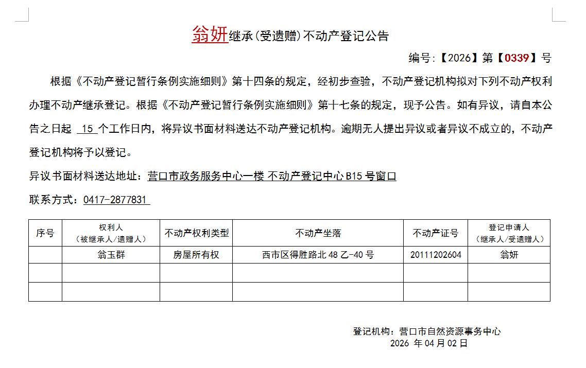 翁妍继承(受遗赠)不动产登记公告-公示公告-营口市不动产登记中心