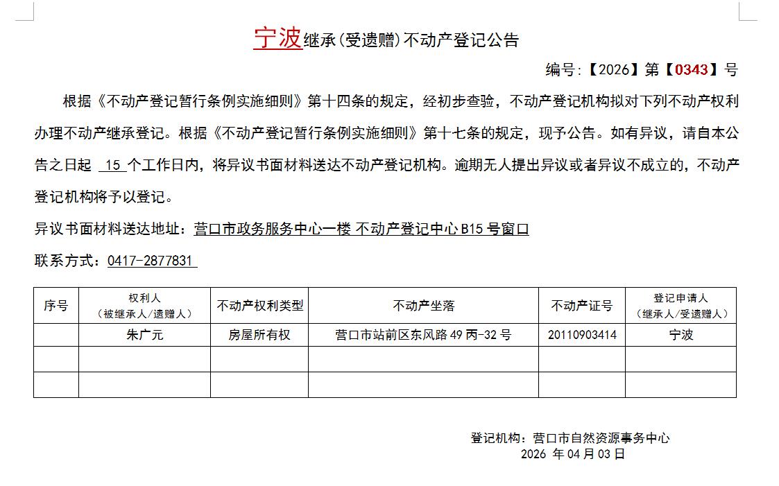 宁波继承(受遗赠)不动产登记公告-公示公告-营口市不动产登记中心
