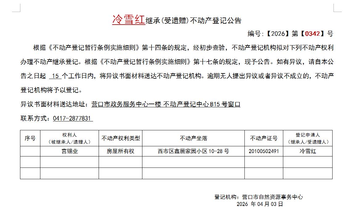 冷雪红继承(受遗赠)不动产登记公告-公示公告-营口市不动产登记中心