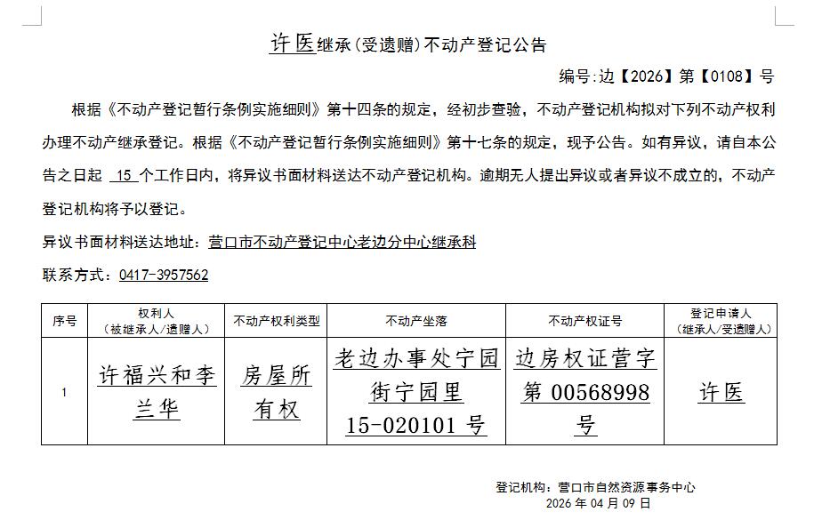 许医继承(受遗赠)不动产登记公告-公示公告-营口市不动产登记中心