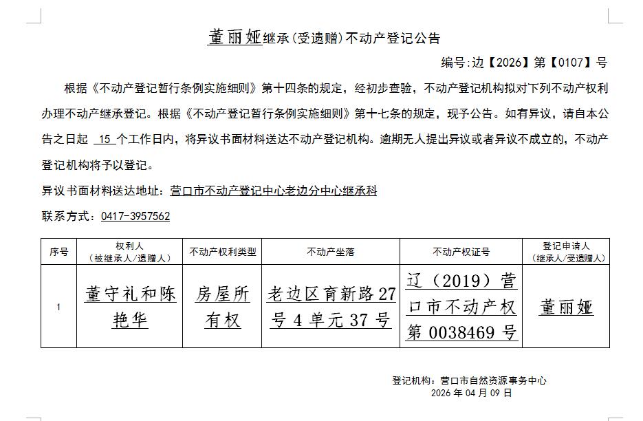 董丽娅继承(受遗赠)不动产登记公告-公示公告-营口市不动产登记中心