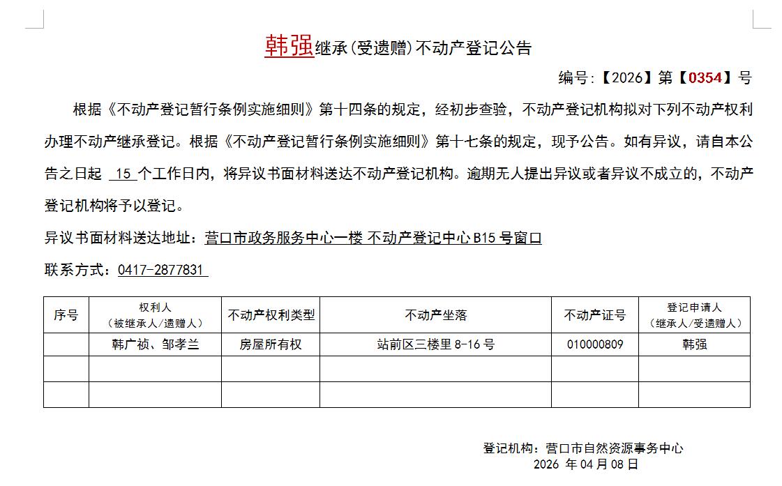 韩强继承(受遗赠)不动产登记公告-公示公告-营口市不动产登记中心