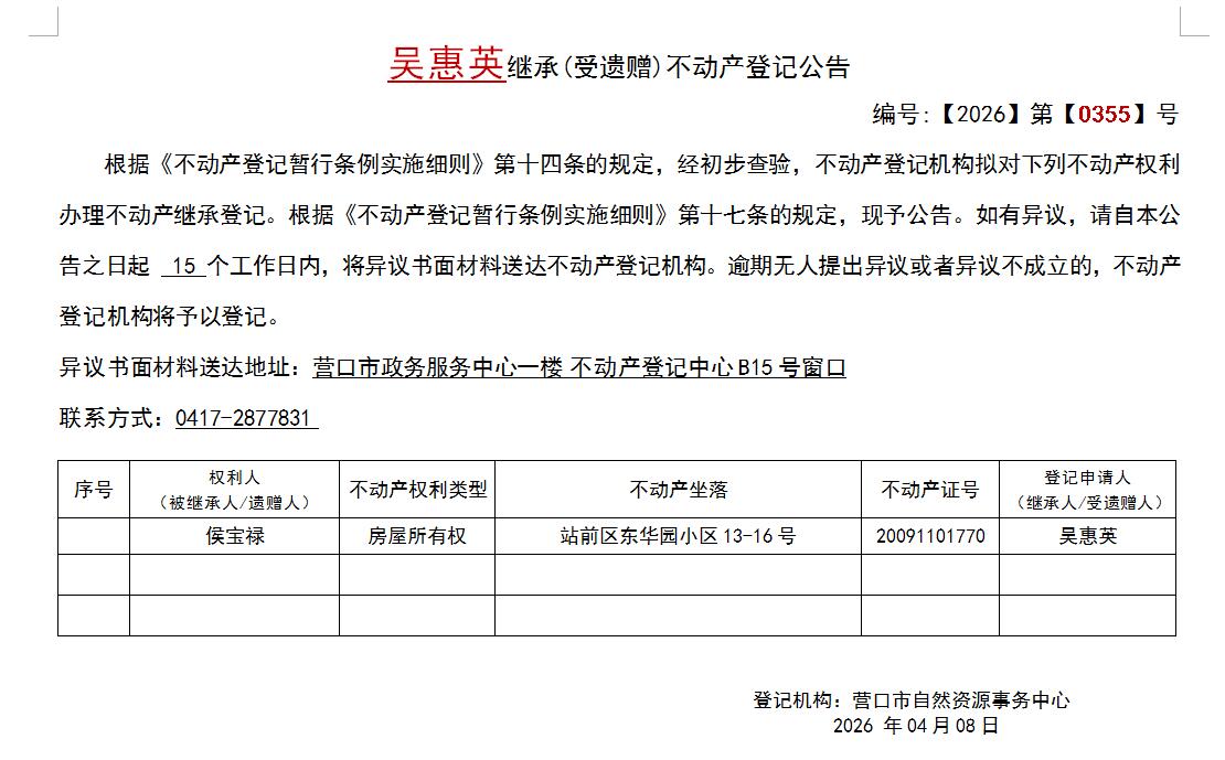 吴惠英继承(受遗赠)不动产登记公告-公示公告-营口市不动产登记中心