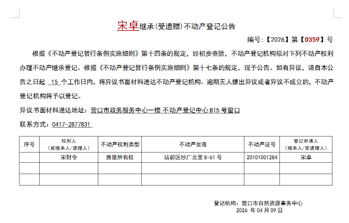宋卓继承(受遗赠)不动产登记公告-公示公告-营口市不动产登记中心