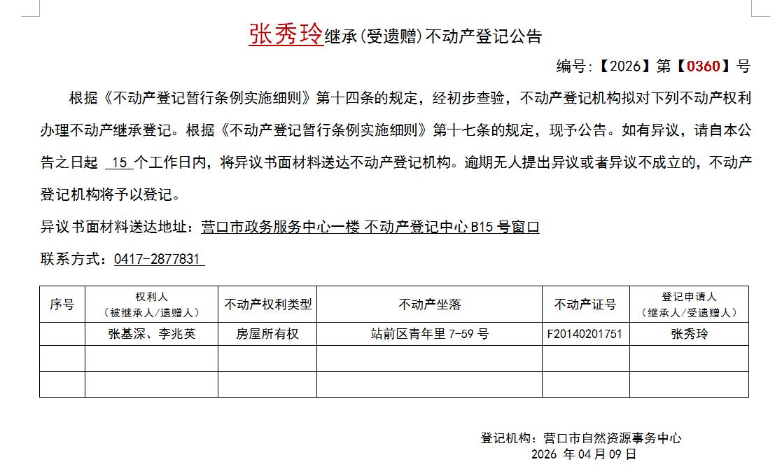 张秀玲继承(受遗赠)不动产登记公告-公示公告-营口市不动产登记中心