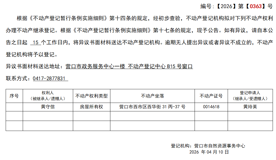 黄玲英继承(受遗赠)不动产登记公告-公示公告-营口市不动产登记中心