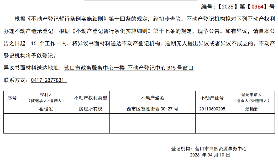 张艳新继承(受遗赠)不动产登记公告-公示公告-营口市不动产登记中心