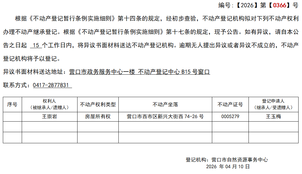 王玉梅继承(受遗赠)不动产登记公告-公示公告-营口市不动产登记中心