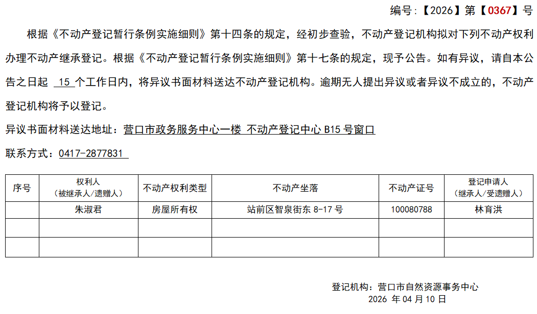 林育洪继承(受遗赠)不动产登记公告-公示公告-营口市不动产登记中心