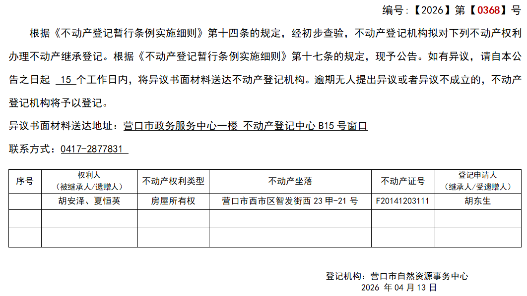 胡东生继承(受遗赠)不动产登记公告-公示公告-营口市不动产登记中心