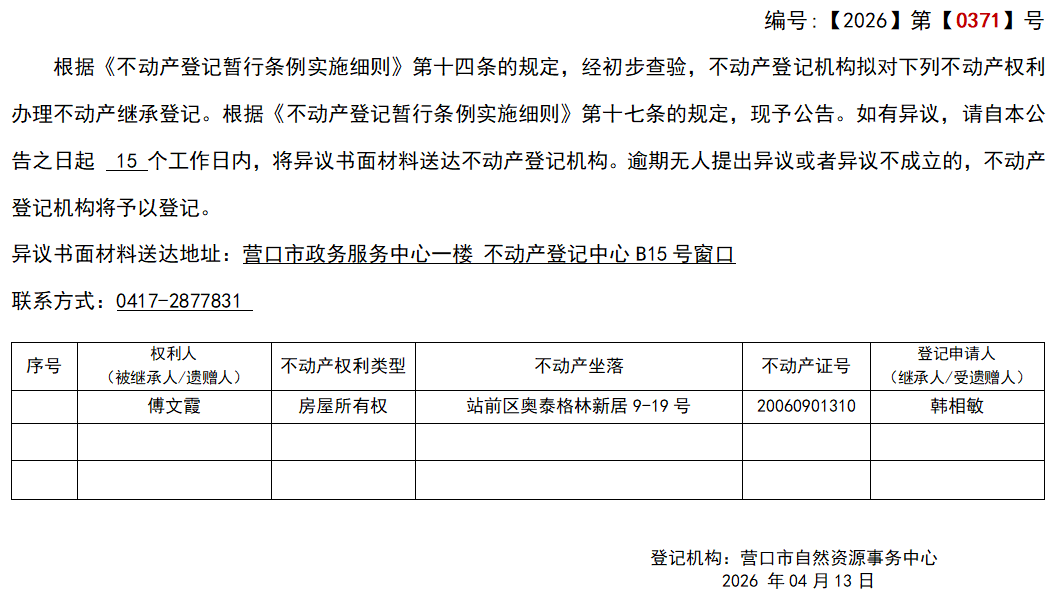 韩相敏继承(受遗赠)不动产登记公告-公示公告-营口市不动产登记中心