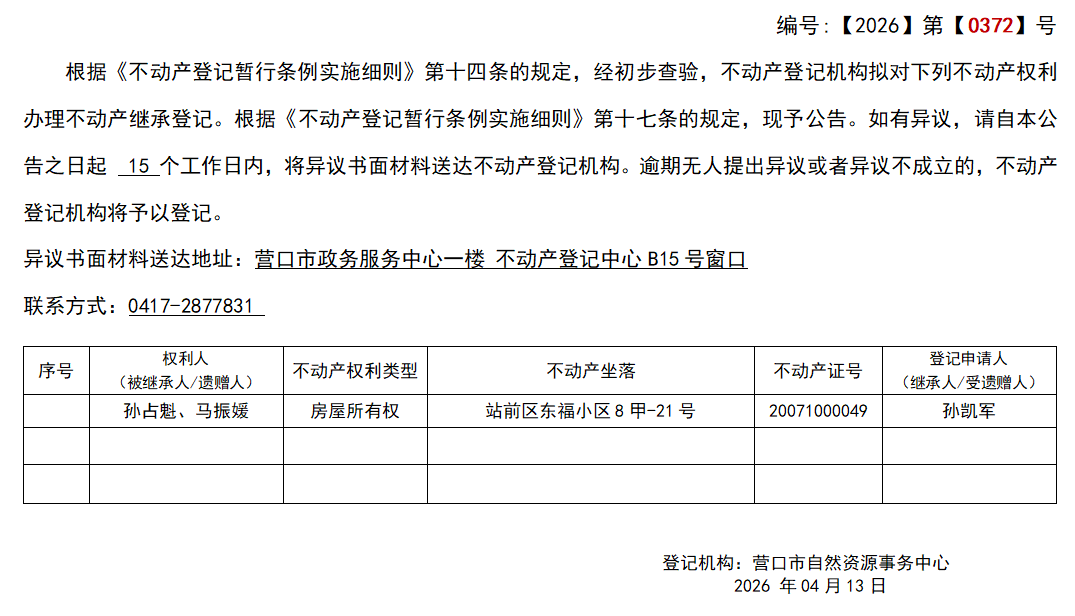 孙凯军继承(受遗赠)不动产登记公告-公示公告-营口市不动产登记中心