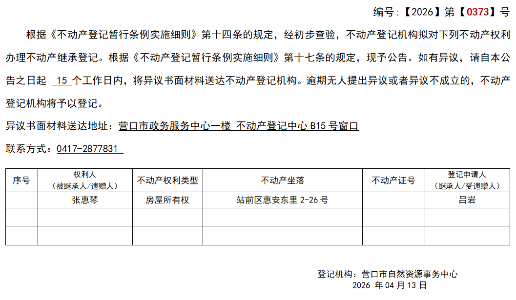 吕岩继承(受遗赠)不动产登记公告-公示公告-营口市不动产登记中心