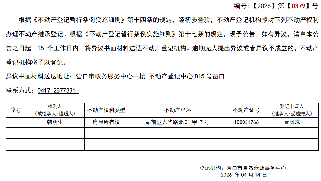 曹凤珠继承(受遗赠)不动产登记公告-公示公告-营口市不动产登记中心