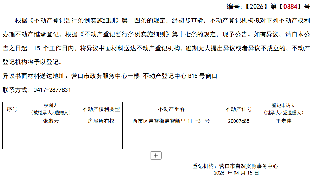 王宏伟继承(受遗赠)不动产登记公告-公示公告-营口市不动产登记中心