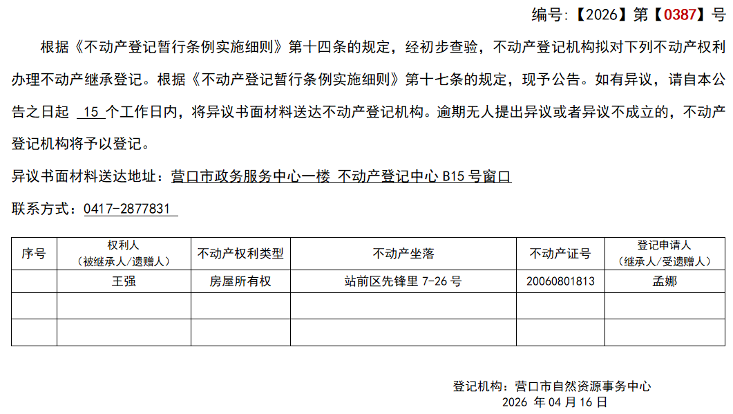 孟娜继承(受遗赠)不动产登记公告-公示公告-营口市不动产登记中心