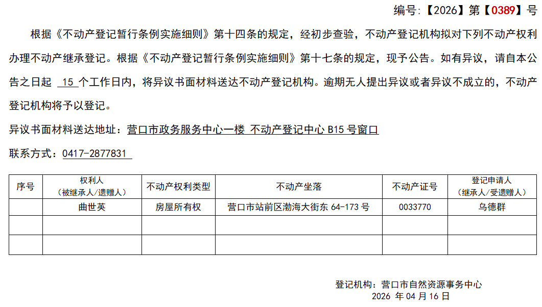 乌德群继承(受遗赠)不动产登记公告-公示公告-营口市不动产登记中心