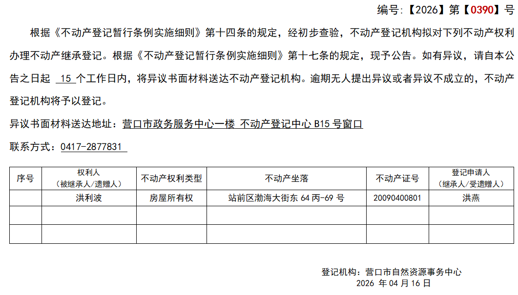 洪燕继承(受遗赠)不动产登记公告-公示公告-营口市不动产登记中心