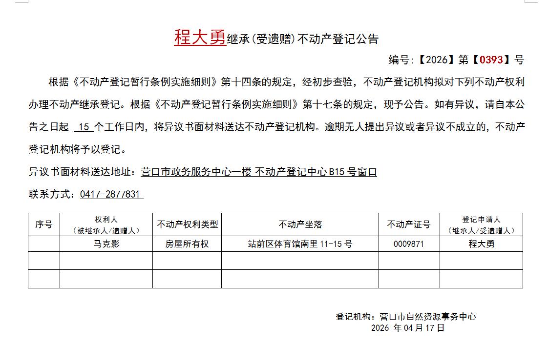程大勇继承(受遗赠)不动产登记公告-公示公告-营口市不动产登记中心
