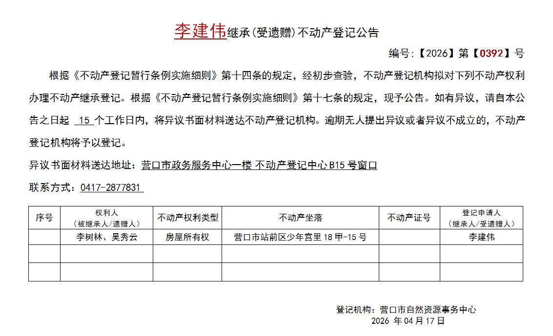 李建伟继承(受遗赠)不动产登记公告-公示公告-营口市不动产登记中心