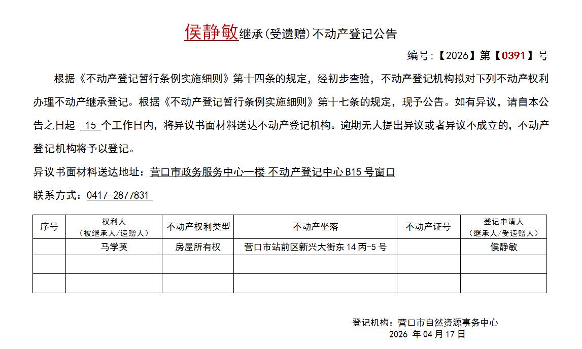 侯静敏继承(受遗赠)不动产登记公告-公示公告-营口市不动产登记中心