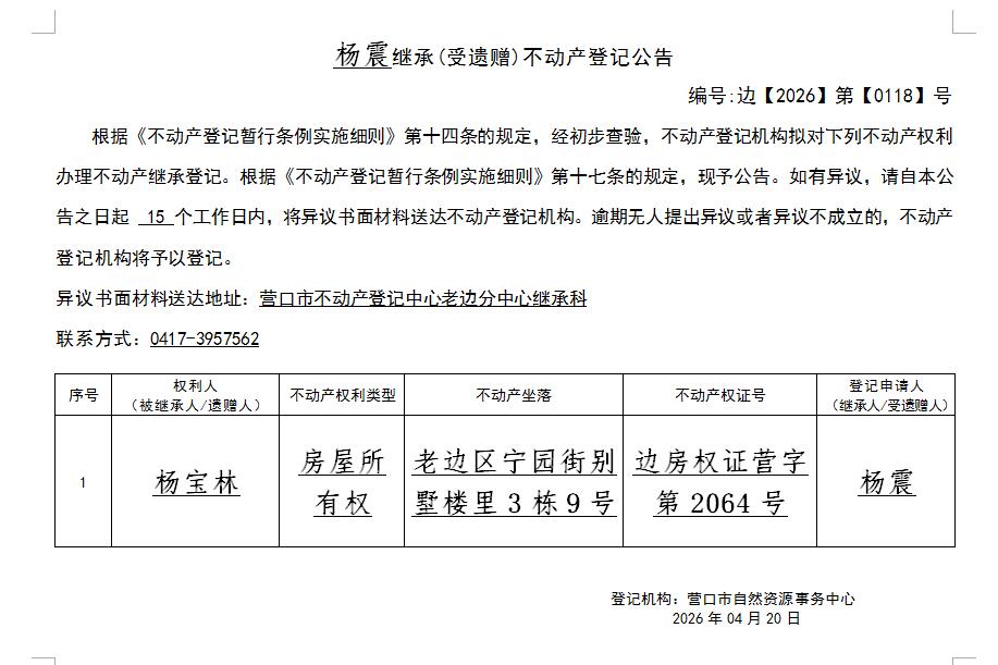 杨震继承(受遗赠)不动产登记公告-公示公告-营口市不动产登记中心