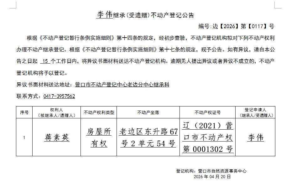 李伟继承(受遗赠)不动产登记公告-公示公告-营口市不动产登记中心